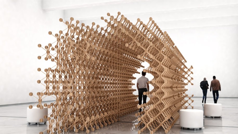 Studio Symbiosis has developed an alternative to throwing away old stalls – a reusable structure called “Plexus“ that can be reconfigured in more than 1,000 different ways. Plexus is designed a bit like classic tinker toys, with nodes and connectors that let stall designers create almost endless variations of shapes and sizes, including adapting to non-standard stall sizes and a differentiated product range. The adaptable system can also be flat packed, for easier transportation with less waste.
